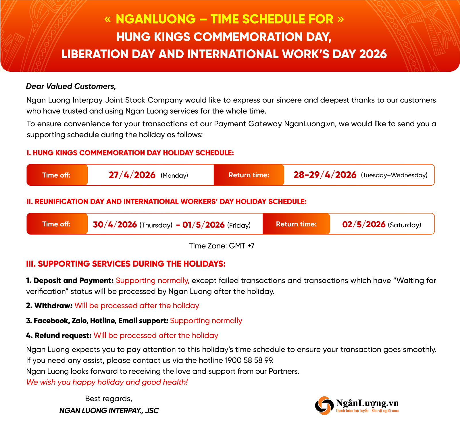 To ensure convenience for your transactions at our Payment Gateway NganLuong.vn, we would like to send you a supporting schedule during the holiday as follows:
